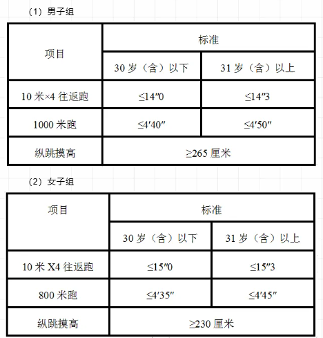 3.參照《關(guān)于印發(fā)公安機關(guān)錄用人民警察體能測評項目和標準(暫行)的通知》(人社部發(fā)〔2011〕48號)的項目及測試規(guī)則,結(jié)合《公安民警體育鍛煉達標手冊》成績標準,體能測評的項目和標準如下: