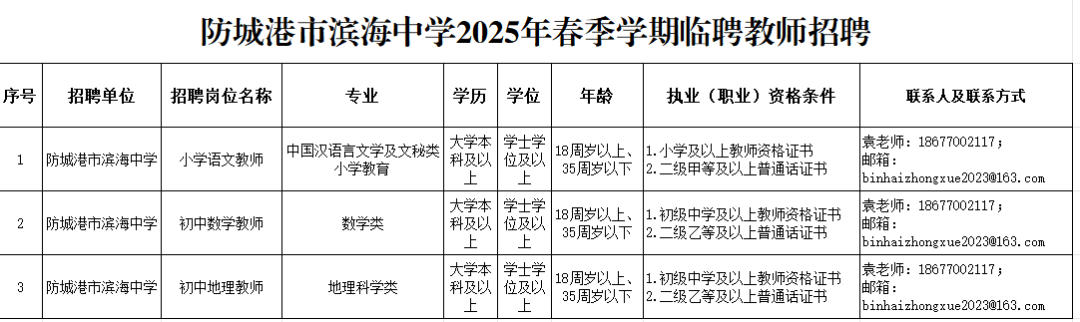 二、報(bào)名方式:1.將個(gè)人簡(jiǎn)歷、學(xué)歷學(xué)位證書、教師資格證等發(fā)到郵箱:binhaizhongxue2023@163.com(郵件名稱備注:姓名+崗位+聯(lián)系方式)2.聯(lián)系電話:袁老師/18677002117