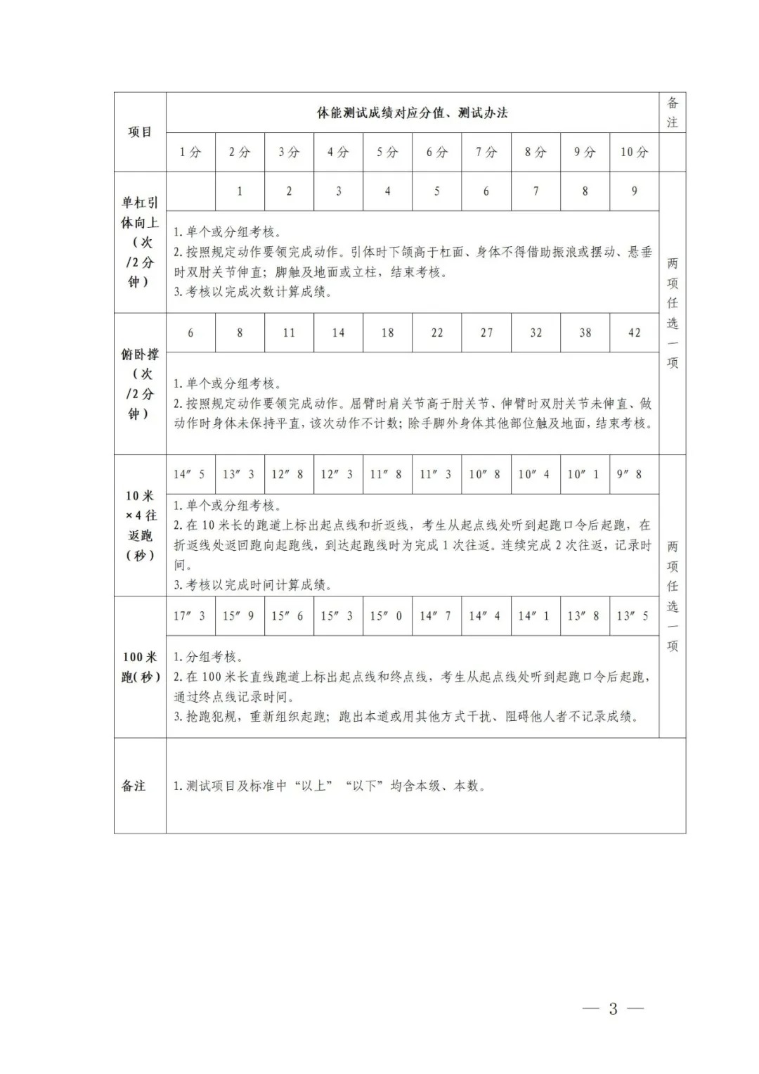 3、10米×4往返跑、100米跑二選一。