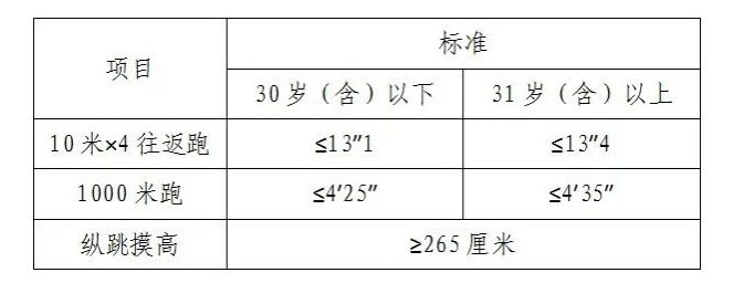 參加者凡有其中一項不達標或放棄,視為體能測評不合格。體能測評合格,方可進入下一環(huán)節(jié)。體能測評項目中,縱跳摸高的測評次數(shù)不超過3次,往返跑的測評次數(shù)不超過2次,長跑測評次數(shù)僅為1次。