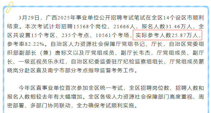 今年廣西事編統(tǒng)考報名人數(shù)31.46萬人,25.87萬人參考,參考率82.22%