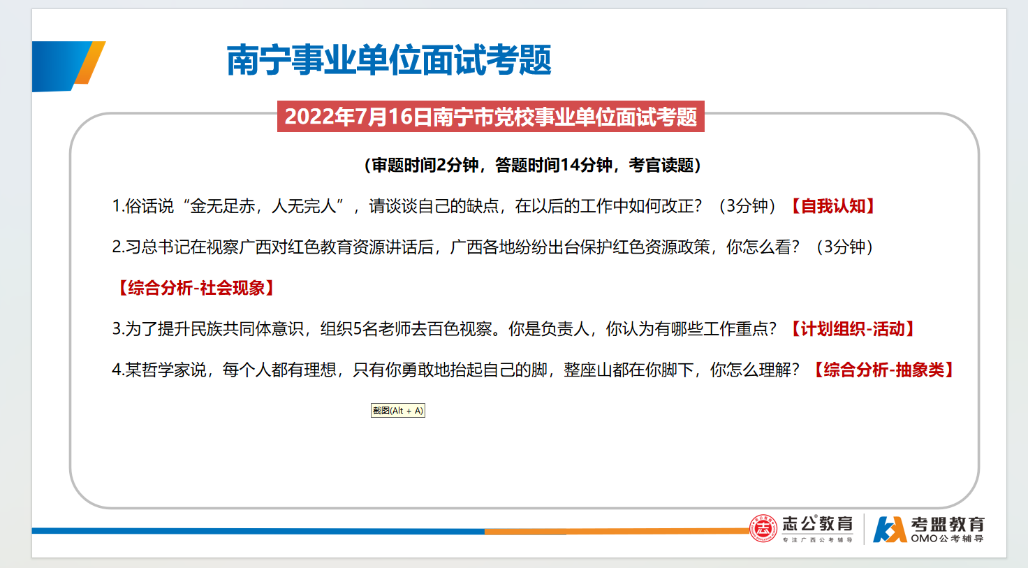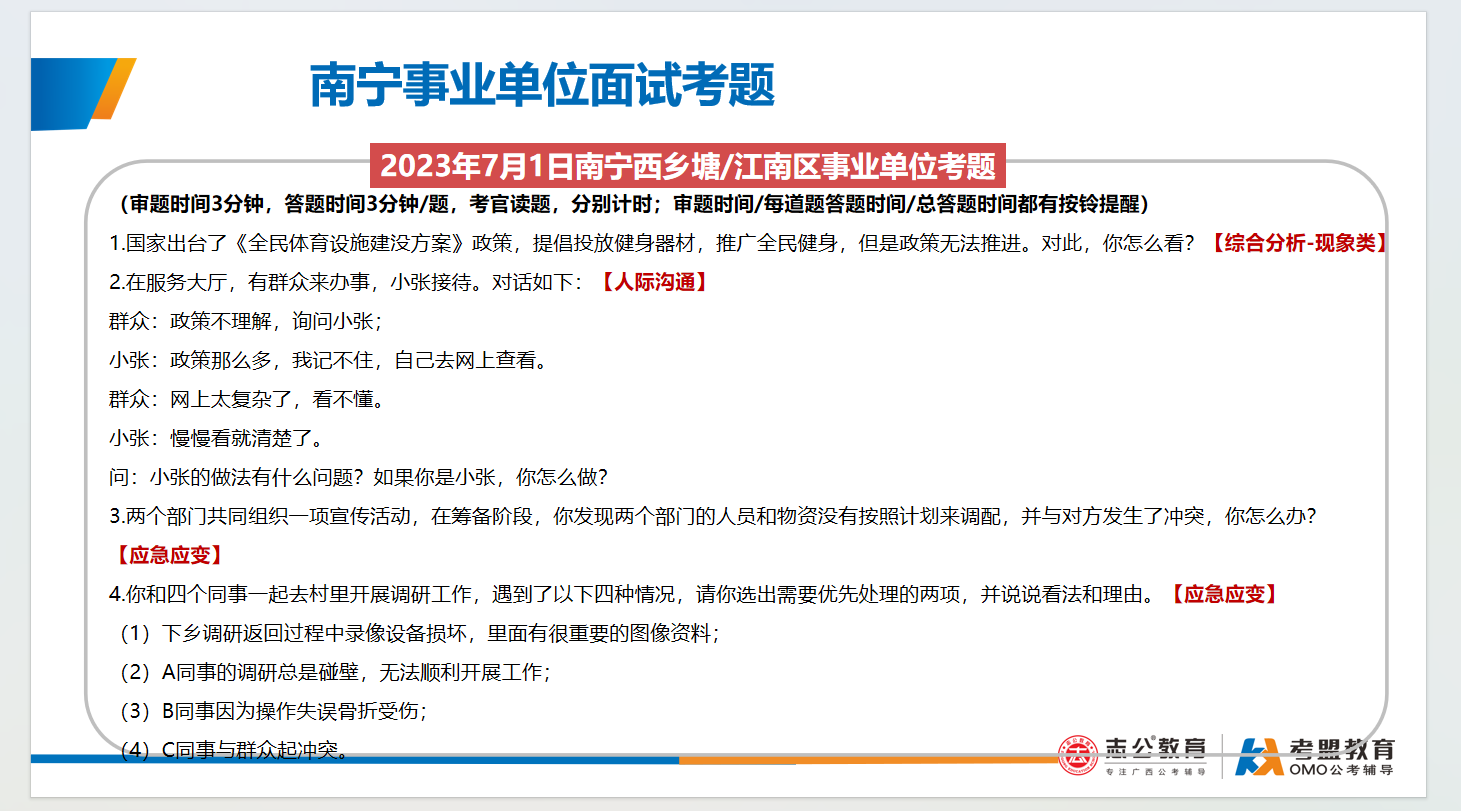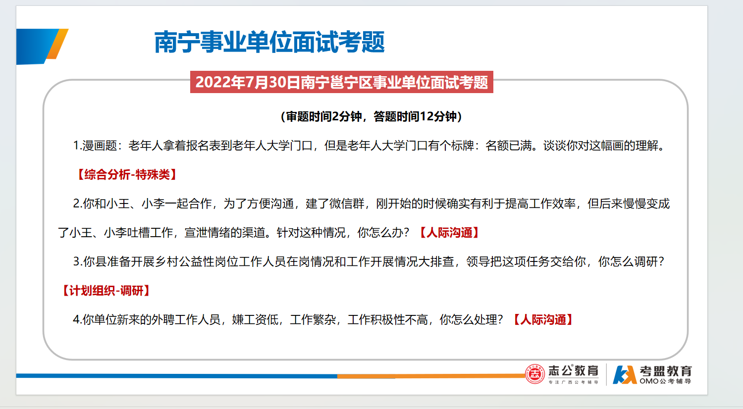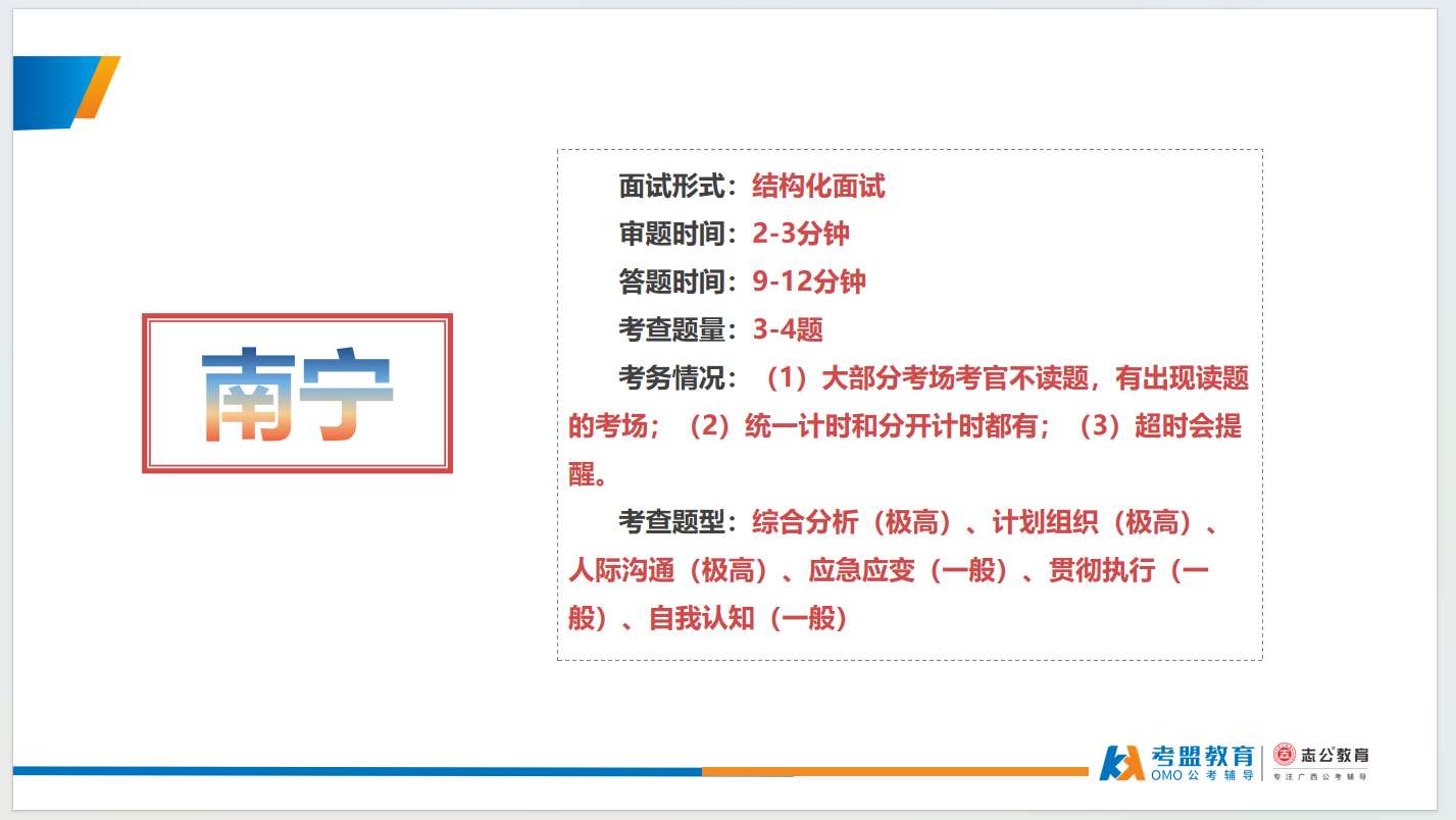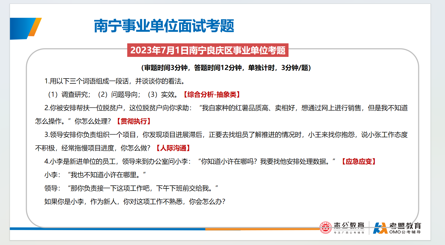 南寧事業(yè)單位面試主要采用結構化面試形式、考查題量有3-4題,答題時間為9-12分鐘,考查題型:綜合分析(極高)、計劃組織(極高)、人際溝通(極高)、應急應變(一般)、貫徹執(zhí)行(一般)、自我認知(一般):