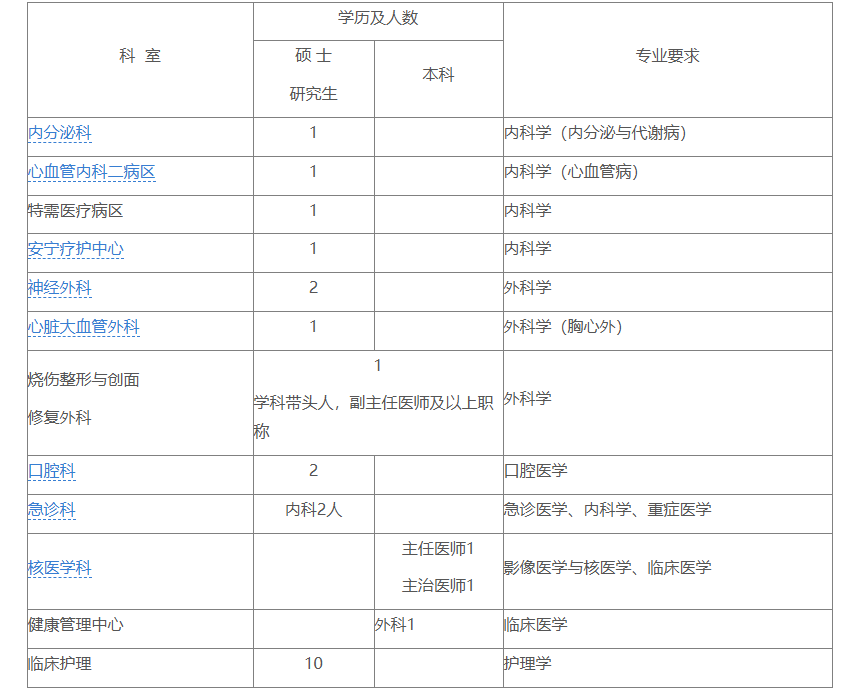 4.臨床醫(yī)師、醫(yī)技人員一般要求35周歲以下,特別優(yōu)秀者可酌情放寬條件;護理人員要求為應(yīng)屆畢業(yè)生,30周歲以下,碩士研究生及以上學(xué)歷者可放寬年齡條件。