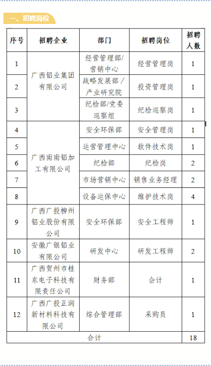2.報名方式:應(yīng)聘者可登錄廣投集團(tuán)官方網(wǎng)站(http://www.gig.cn),依次點(diǎn)擊“人力資源-廣納英才”,進(jìn)入“社會招聘-招聘崗位”專欄,找到“鋁業(yè)”相應(yīng)崗位并投遞簡歷。