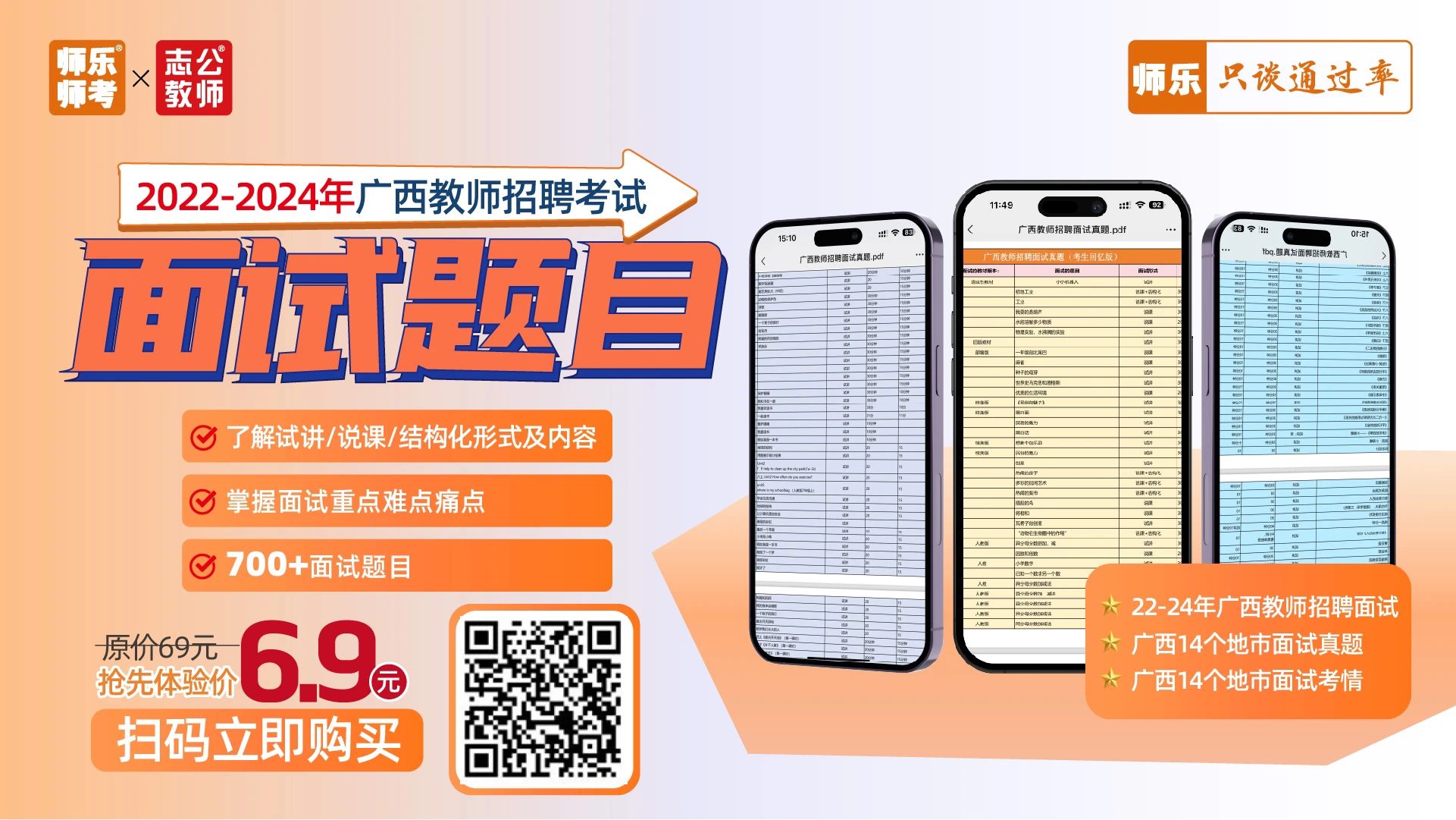 ??寫(xiě)作邏輯+面試導(dǎo)入金句點(diǎn)撥 ?含13+篇試講+說(shuō)課+結(jié)構(gòu)化 搶先體驗(yàn)價(jià):6.9元 ??14地市教招面試zhen題 了解試講/說(shuō)課/結(jié)構(gòu)化形式及內(nèi)容 面試禮儀課 ??面試禮儀干貨介紹 正反面案例直觀對(duì)比 ??著裝、問(wèn)候、儀態(tài)、言談禮儀等事項(xiàng)介紹 【師樂(lè)】廣西教招備考群 ??最新公告 備考資料 ??刷題打卡 考試交流