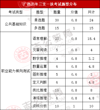 上篇我們寫到,三支一扶的待遇,在廣西這個(gè)待遇還算不錯(cuò),政策上的支持也非常好,那么預(yù)計(jì)這個(gè)月月底出公告的三支一扶,啥時(shí)候筆試呢?2024年廣西三支一扶筆試時(shí)間是7月13日,其筆試科目為《綜合知識(shí)》一科,滿分100分?;谕昕忌幕貞洠C合知識(shí)內(nèi)容主要包括公共基礎(chǔ)知識(shí)和行測(cè)職業(yè)能力測(cè)試兩個(gè)科目,而各題型的題量及分值如下圖所示: