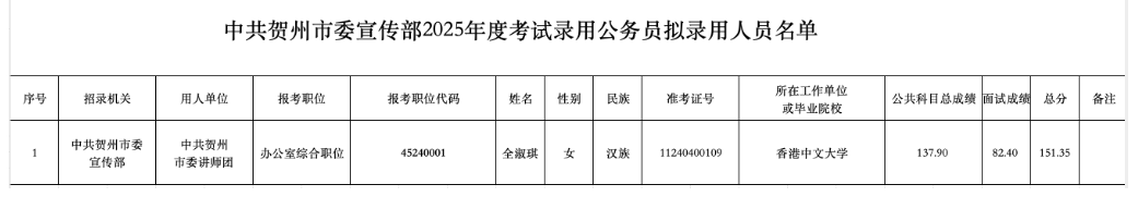 根據(jù)《廣西壯族自治區(qū)2025年度考試錄用公務員公告》要求,經(jīng)過公開報名、資格審查、筆試、面試、體檢、考察等程序,確定全淑琪1名同志為擬錄用公務員,現(xiàn)予以公示。公示期為2025年6月6日至6月12日(5個工作日)。如對擬錄用人員有異議,請在公示期內(nèi)向中共賀州市委宣傳部實名反映。