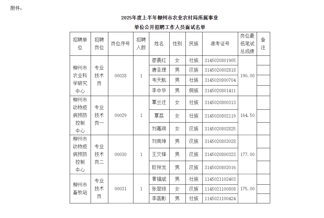 附件:2025年度上半年柳州市農業(yè)農村局所屬事業(yè)單位公開招聘工作人員面試名單