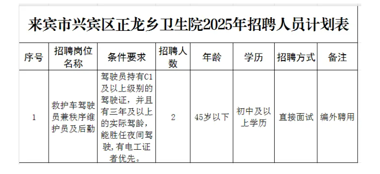 來(lái)賓市興賓區(qū)正龍鄉(xiāng)衛(wèi)生院2025開(kāi)招聘非醫(yī)學(xué)類編外工作人員2人