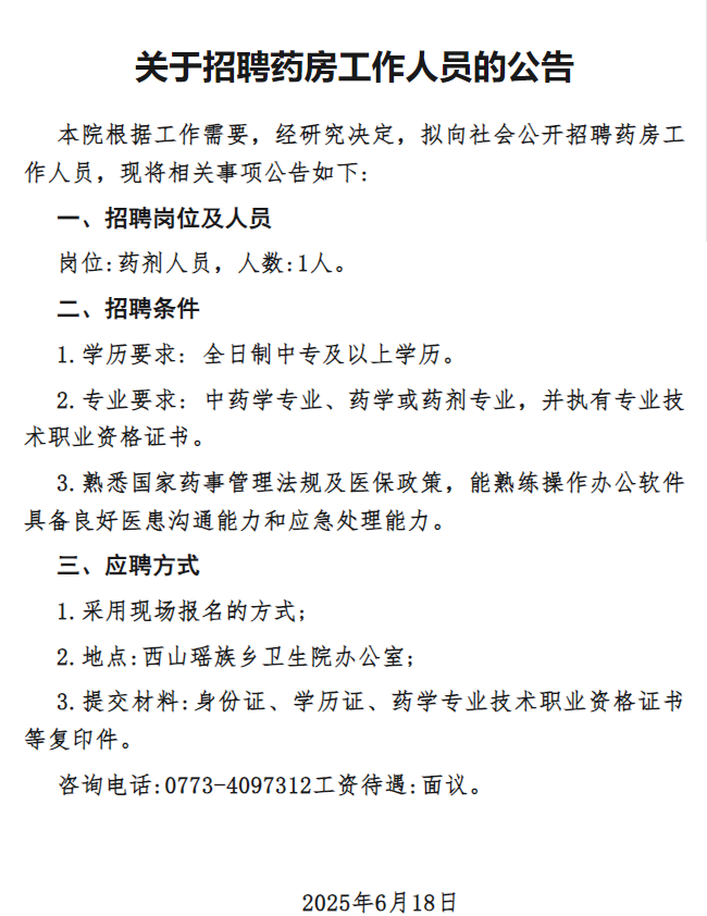 原文標題:灌陽縣西山瑤族鄉(xiāng)衛(wèi)生院關于招聘藥房工作人員的公告