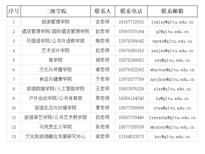 聯(lián)系地址:廣西桂林市雁山區(qū)良豐路26號桂林旅游學(xué)院人事處 郵 編:541006 聯(lián)系人:鄧?yán)蠋?/p>