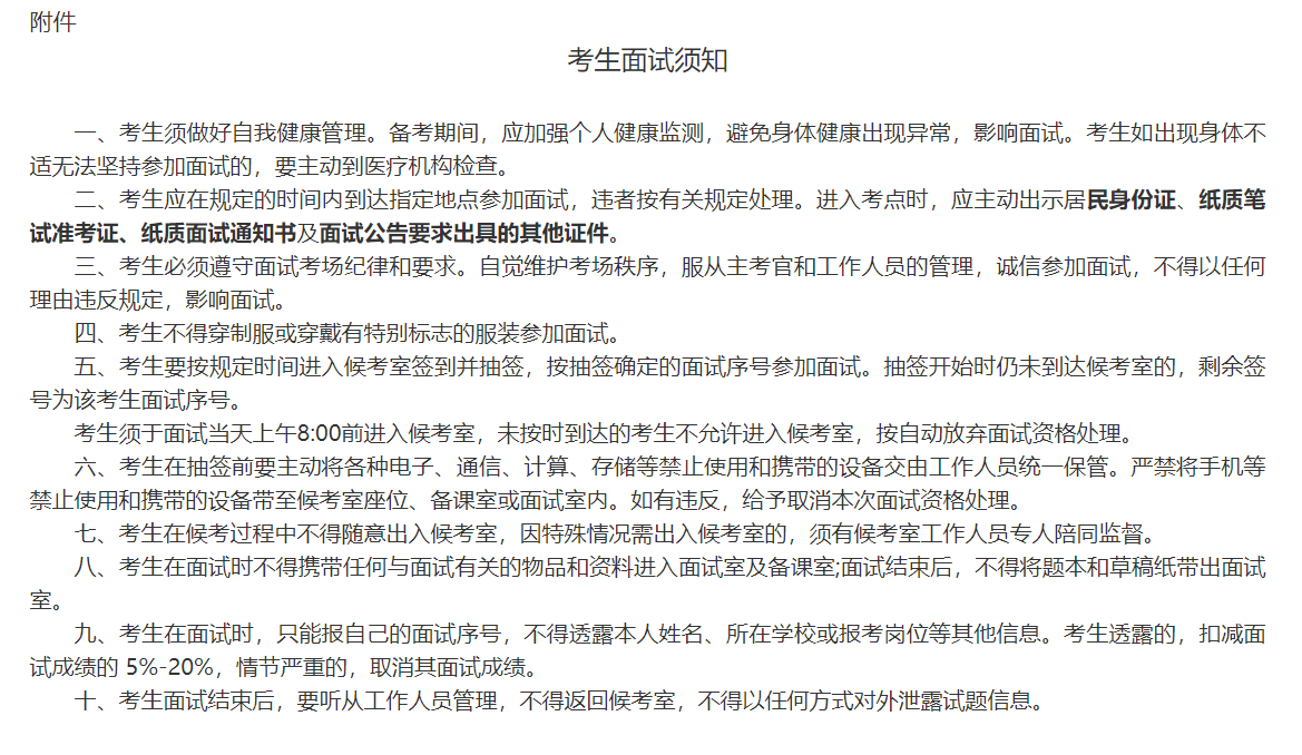 (四)考生在面試時,只能報自己的面試序號,不得透露考生姓名、所在學(xué)?;騿挝?、籍貫等信息??忌嘎兜?,扣減面試成績的5%-20%,情節(jié)嚴(yán)重的,取消其面試成績。