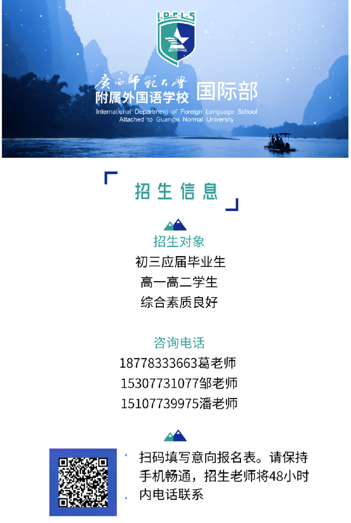廣西師范大學(xué)附屬外國語學(xué)校位于以山水之美聞名世界的桂林市,教育教學(xué)成績斐然。其國際部是廣西壯族自治區(qū)最早批準(zhǔn)成立的國際部,自2011年成立以來,積極引進國外先進教育理念,整合師大附外的優(yōu)質(zhì)基礎(chǔ)教育資源,堅持社會主義核心價值觀為導(dǎo)向,培養(yǎng)具有崇高理想、愛國信念和突出跨文化交際能力的社會主義新型人才。
