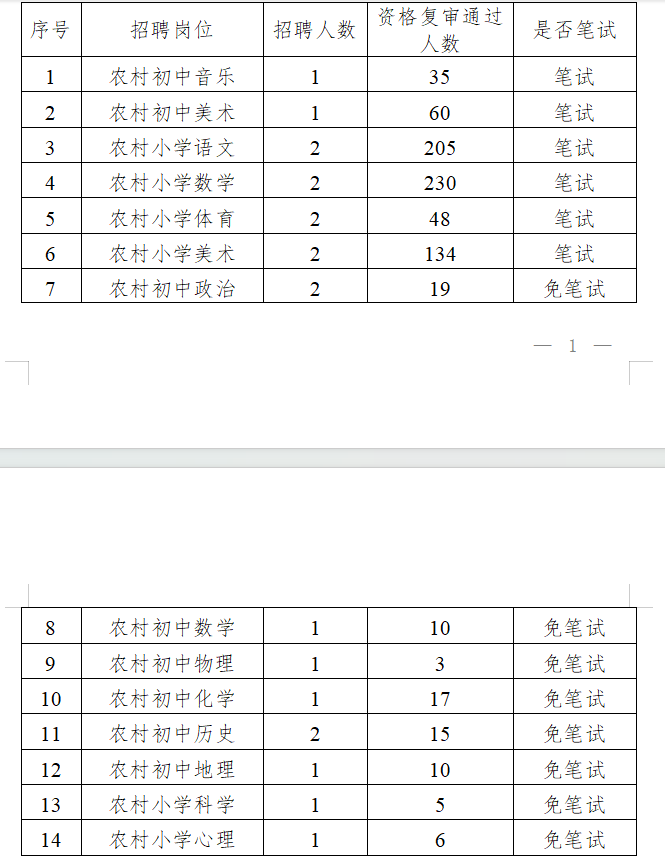 根據(jù)《桂林市雁山區(qū)2025年特崗教師招聘公告》要求“筆試按實(shí)際通過資格復(fù)審人數(shù)開考;招聘崗位資格復(fù)審?fù)ㄟ^人數(shù)不足20人免筆試,資格復(fù)審?fù)ㄟ^人數(shù)20人以上(含20人,研究生及以上學(xué)歷不包含在內(nèi),研究生及以上學(xué)歷免筆試),需進(jìn)行筆試。”經(jīng)現(xiàn)場(chǎng)資格復(fù)審,桂林市雁山區(qū)2025年特崗教師招聘筆試、免筆試學(xué)科崗位情況如下: