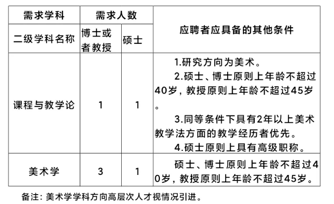 美術(shù)學(xué)院2025年計(jì)劃在美術(shù)學(xué)、課程與教學(xué)論(美術(shù))等專(zhuān)業(yè)方向招聘6位專(zhuān)任教師,其中計(jì)劃招聘博士或者教授4人,碩士2人。