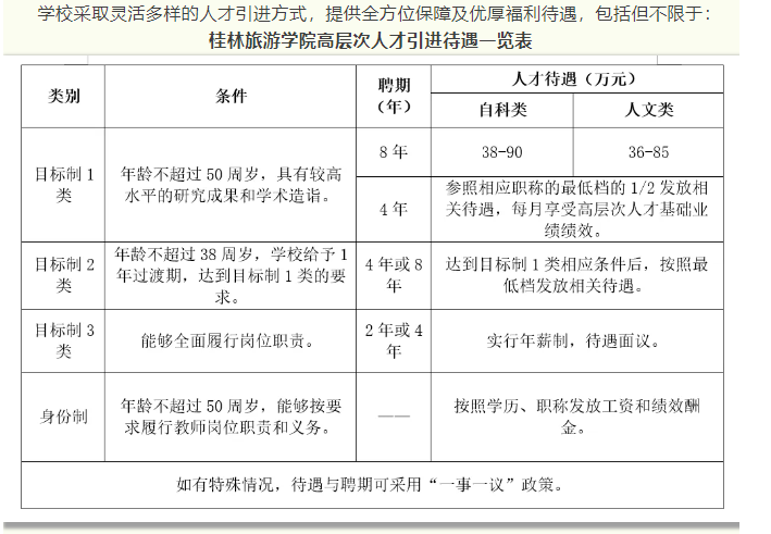 4.根據(jù)自治區(qū)政府文件要求,符合相應(yīng)條件者,學(xué)校積極配合申請廣西壯族自治區(qū)高層次人才認定和各類人才項目,若入選可享受各類優(yōu)厚的人才待遇,詳情請登錄廣西高層次人才“一站式”服務(wù)平臺(http://www.gxrc.org/)查閱。首次來桂工作的35歲以下、具有博士學(xué)位的青年人才,可按照政策申領(lǐng)自治區(qū)青苗人才普惠性支持。如入選桂林市高層次人才,還可以享受桂林市高層次人才有關(guān)津貼、購房補貼和個稅獎勵等人才補助。詳見桂林市高層次人才一站式服務(wù)平臺(https://gcc.glrcw.com/)。