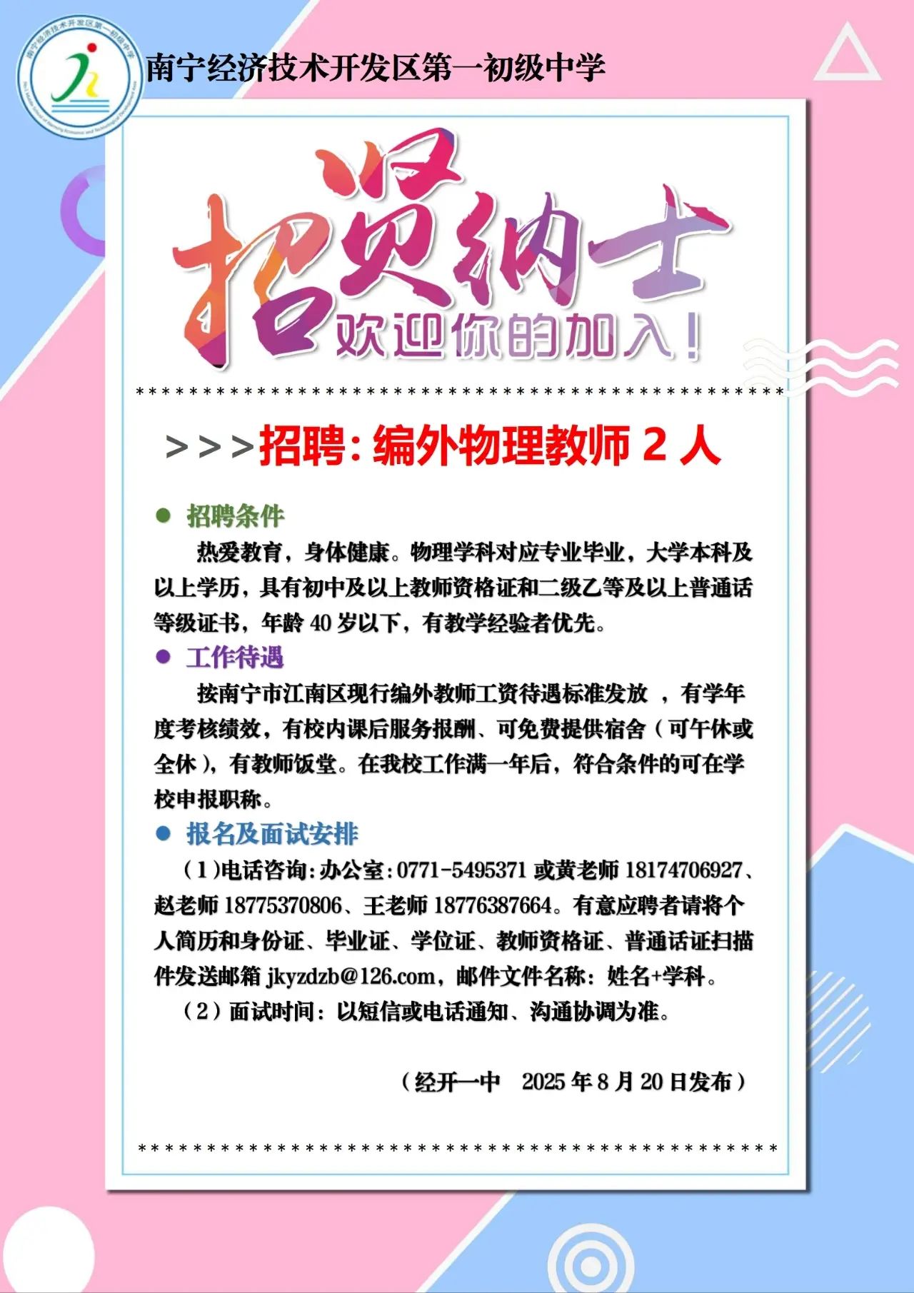 2025年南寧經濟技術開發(fā)區(qū)第一初級中學招聘物理教師