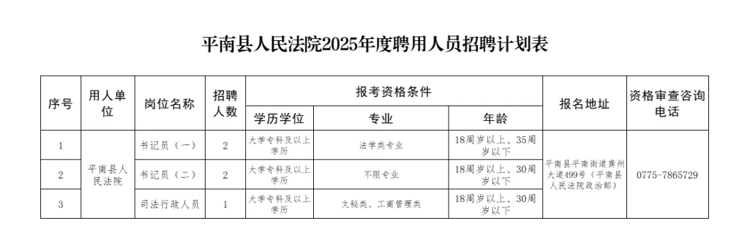 本次招聘崗位為書記員4名,司法行政人員1名。詳見附件1《平南縣人民法院2025年度聘用人員招聘計劃表》(以下簡稱《招聘計劃表》)。
