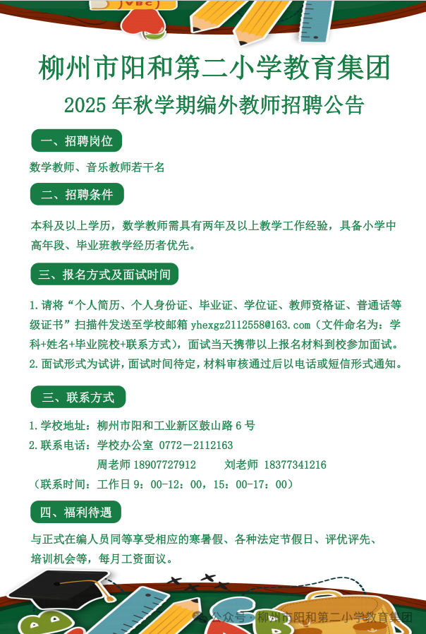 原文標題:柳州市陽和第二小學(xué)教育集團2025年秋學(xué)期編外教師招聘公告