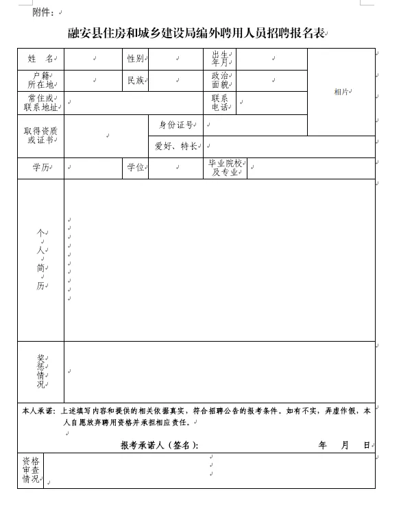 (1)報名方式:應聘者將報名表等相關(guān)材料發(fā)送至融安縣住建局郵箱:raxjsj@163.com,報名材料主要包括:報名表(請自行下載填寫,并手寫簽名)、身份證、學歷學位證書、資格證書、獲獎證書等。以上材料均需掃描成PDF版本。