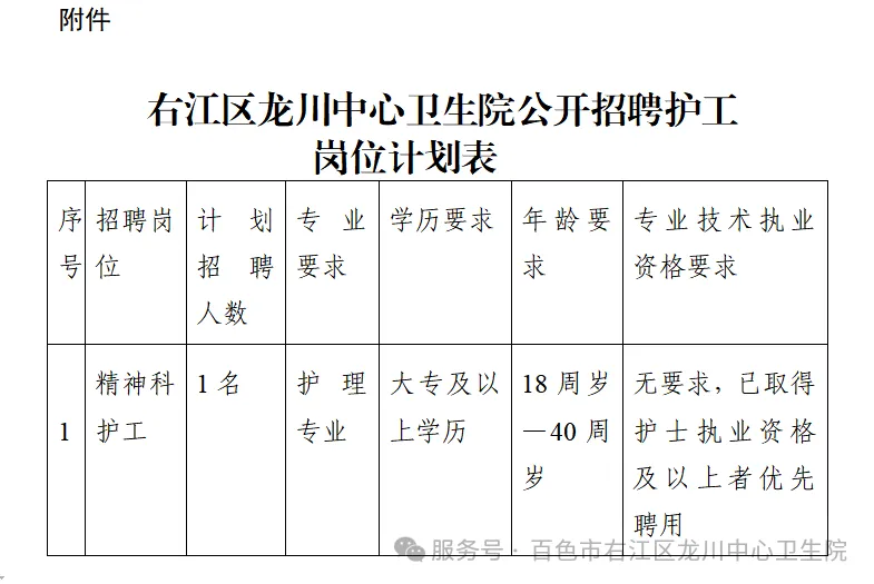 附件:右江區(qū)龍川中心衛(wèi)生院公開(kāi)招聘護(hù)工崗位計(jì)劃表
