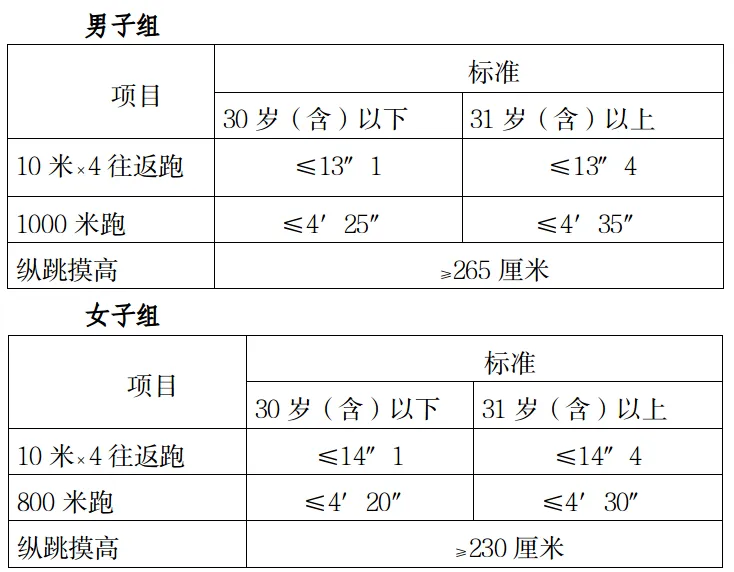 測評結(jié)果分為合格和不合格。一般體能測評三項(xiàng)成績均達(dá)標(biāo)的方為合格,其中具有研究生及以上學(xué)歷報(bào)考人員,體能測評三個項(xiàng)目中有任何兩項(xiàng)達(dá)標(biāo)的,即視為合格。體能測試時間、地點(diǎn):另行通知。