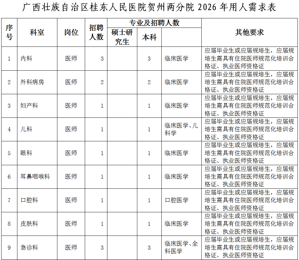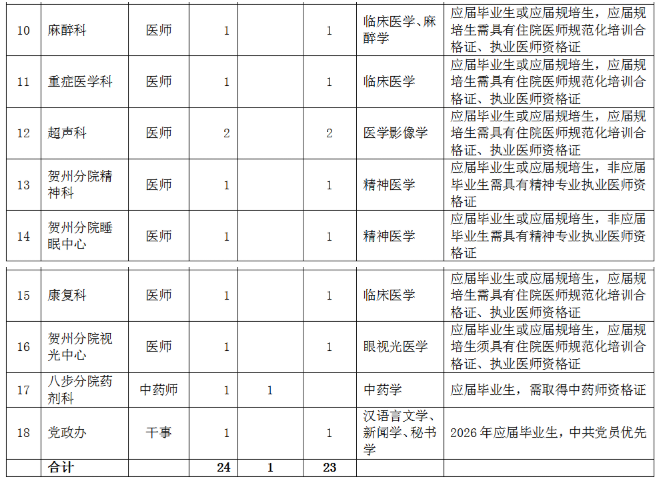 (應聘報名二維碼)同時,按以下要求提供個人應聘材料(電子版)發(fā)電子郵箱:gdyy2817726@163.com(郵件主題請標明:“姓名+賀州兩分院”字樣)。應屆畢業(yè)生:個人簡歷、身份證、就業(yè)推薦表、成績單、各種獎項獎勵證書、外語等級證書等。非應屆畢業(yè)生:個人簡歷、身份證、畢業(yè)證、畢業(yè)證備案登記表、學位證、學位證備案登記表、職稱證、執(zhí)業(yè)證、住院醫(yī)師規(guī)范化培訓合格證、工作證明等。報名時所提交的申請材料必須真實、準確,因報名時提交的申請材料不真實、不完整或錯誤填寫報名信息,造成資格審查、面試資格審查不通過的,后果由報名人員自行承擔。(2)資格審核。人事科依據(jù)招聘公告和用人需求規(guī)定的資格條件對應聘人員簡歷進行收集和資格初步審查,經(jīng)招聘工作領導小組審核后,確定符合崗位條件報名人員名單,由醫(yī)院人事科電話或短信通知符合條件人員。(3)考核。考核筆試和面試由人事科負責組織實施,協(xié)助部門為醫(yī)務部、護理部、科教科以及用人科室,紀律監(jiān)督部門為監(jiān)察室。逾期未參加則視為自愿放棄。(4)試工。通過考核的非應屆畢業(yè)應聘人員,須到醫(yī)院試工5天。試工不通過,不予聘用。(5)體檢。體檢工作由廣西壯族自治區(qū)桂東人民醫(yī)院按照有關規(guī)定統(tǒng)一組織。體檢標準參照《廣西壯族自治區(qū)事業(yè)單位公開招聘人員體檢通用標準(試行)》《廣西壯族自治區(qū)事業(yè)單位公開招聘人員體檢操作手冊(試行)》執(zhí)行。體檢不合格或隱瞞真實情況致使體檢結果失真的,不予聘用。因體檢不合格空缺崗位的,將按考核的綜合成績,從高到低,順位補充體檢人員。(6)公示和聘用。對擬聘非應屆畢業(yè)應聘者在全院范圍內進行公示,公示期為5個工作日,公示期滿無異議按程序辦理聘用手續(xù)。對公示有異議,經(jīng)核實影響聘用的,取消其聘用資格;對反映問題難以核實的暫緩聘用,待核實清楚后按有關規(guī)定辦理。