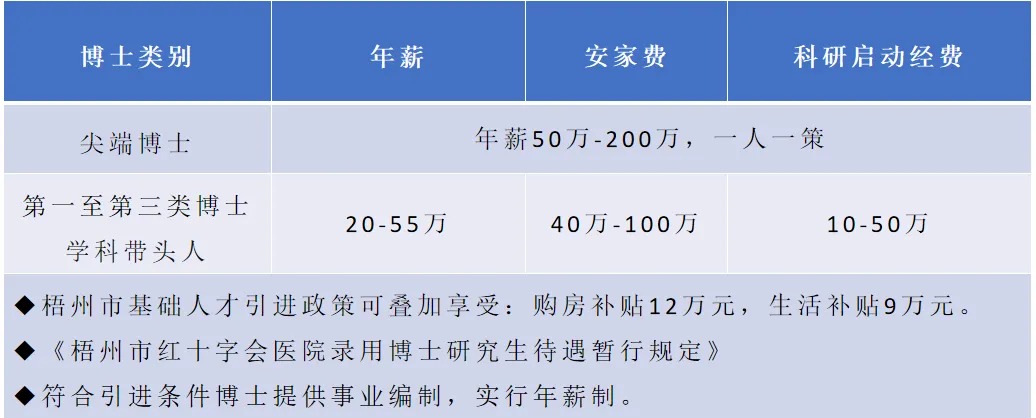 博士研究生學歷學位的急需緊缺專業(yè)人才:享受醫(yī)院引進博士待遇20-200萬元/年,實行年薪制待遇一人一議,提供科研啟動經(jīng)費10萬-50萬元,疊加享受梧州市人才引進補助,安家費52-125萬元,生活補貼9-12萬元。