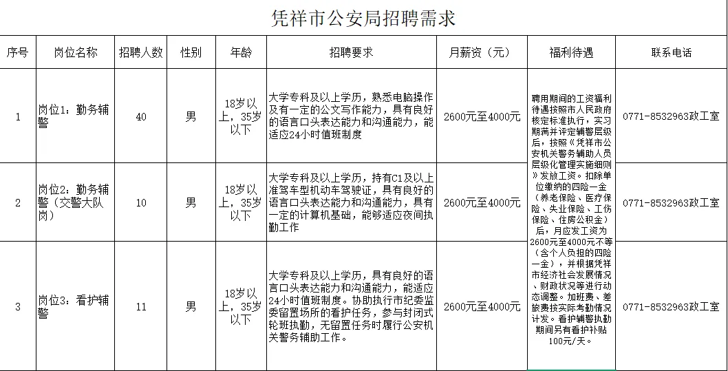 (二) 報(bào)名地點(diǎn)憑祥市公安局(憑祥市北大路69號(hào))報(bào)名及咨詢電話:0771-8532963報(bào)名投簡(jiǎn)歷郵箱:pxgazgs@163.com報(bào)名請(qǐng)附上身份證復(fù)印件、學(xué)歷畢業(yè)證書(shū)復(fù)印件