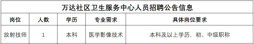 根據(jù)工作需要,銀山街道萬達社區(qū)衛(wèi)生服務(wù)中心現(xiàn)向社會招聘相關(guān)崗位人員,所有崗位按社區(qū)人員條件招聘,執(zhí)行社區(qū)待遇,具體崗位需求如下: