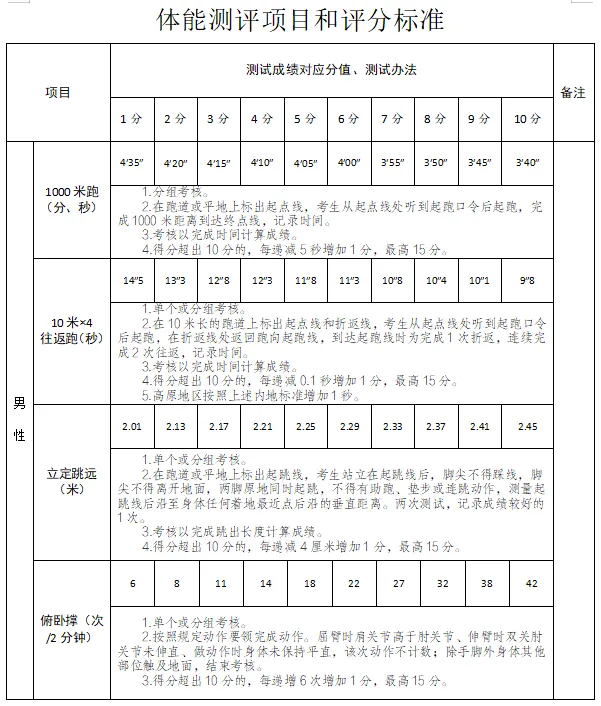 1.體能測評(60%):體能測試內(nèi)容為四個項目,1000米跑(分、秒)、俯臥撐(次/2分鐘)、10米*4往返跑(秒)、立定跳遠(米)。報考人員須自帶運動服、運動鞋完成體能測試。