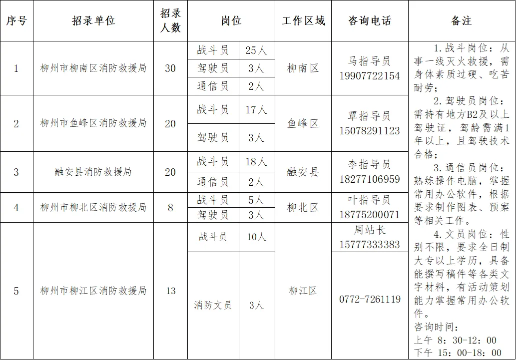 政府專職消防員91人。崗位要求:男性,身高165CM以上,雙眼裸視力4.8以上,需具備高中(中專)以上學(xué)歷,年齡為18-28周歲以下(有部隊服役經(jīng)歷或者全日制大專及以上學(xué)歷可放寬至30周歲),身體素質(zhì)過硬、吃苦耐勞、心理健康,無遺傳性、傳染性和慢性疾病,符合體檢標(biāo)準(zhǔn)。