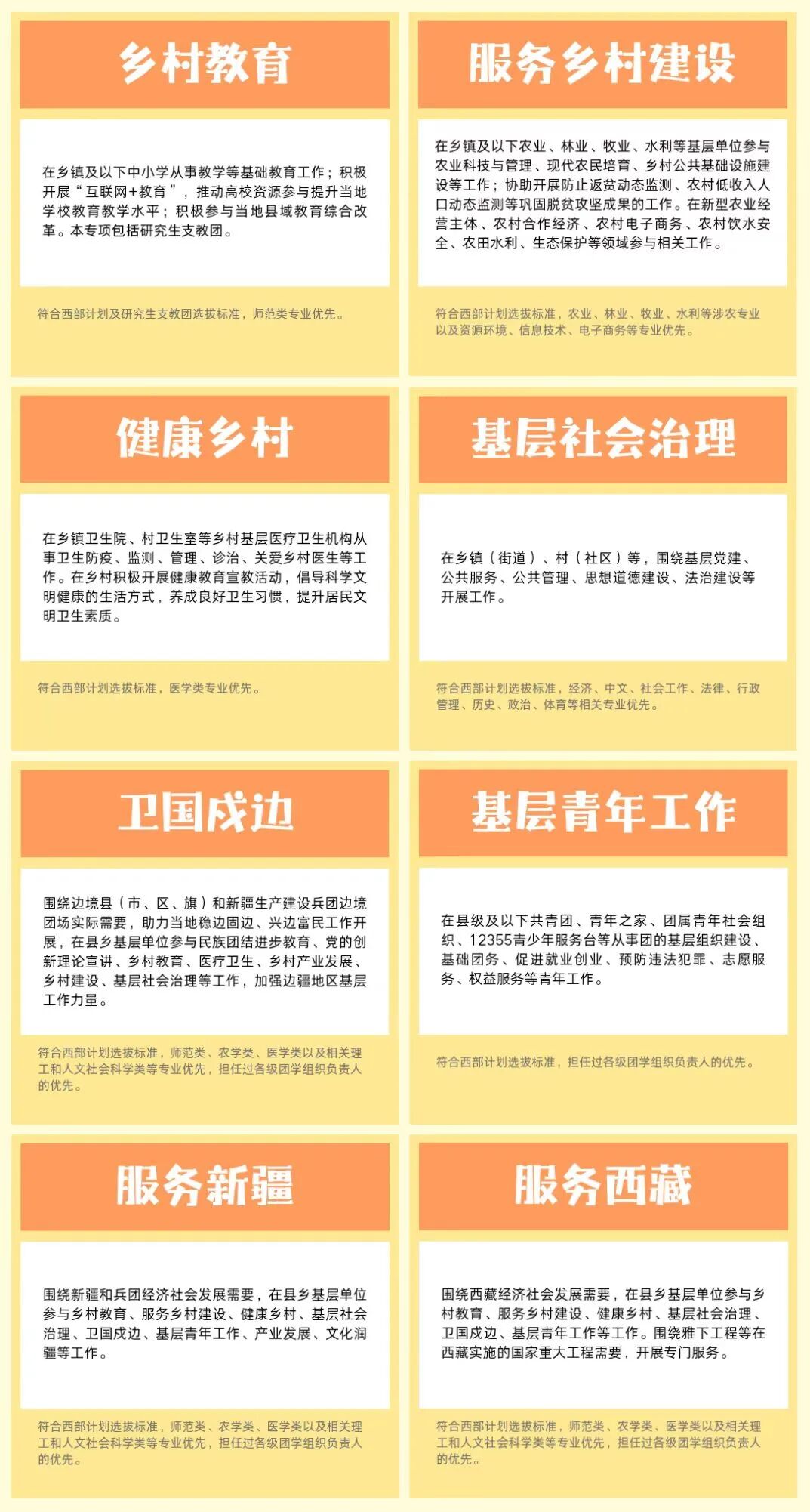 2026年西部計劃項目將深入貫徹落實習近平總書記重要回信精神,引導廣大高校畢業(yè)生積極參加鄉(xiāng)村教育、服務鄉(xiāng)村建設、健康鄉(xiāng)村、基層社會治理、衛(wèi)國戍邊、基層青年工作、服務新疆、服務西藏等8個專項,以青春力量服務國家戰(zhàn)略、服務百姓民生、服務社會治理。今年全國預計新招募約6萬人,赴新疆、西藏等27個?。ㄗ灾螀^(qū)、直轄市)和新疆生產建設兵團的基層一線開展志愿服務,90%以上的服務崗位在鄉(xiāng)鎮(zhèn)及以下。西部計劃志愿者服務期為1至3年,服務協(xié)議一年一簽。為激勵志愿者服務期滿繼續(xù)扎根西部、扎根基層,國家在升學、就業(yè)、培養(yǎng)等多個方面給予政策支持。