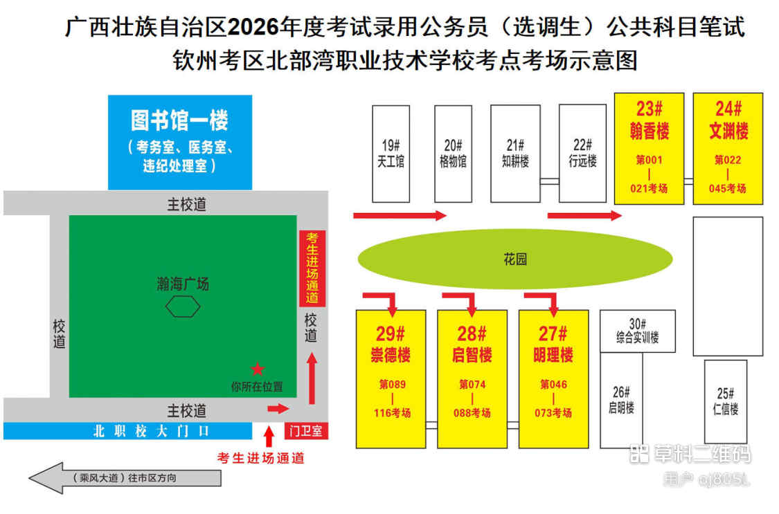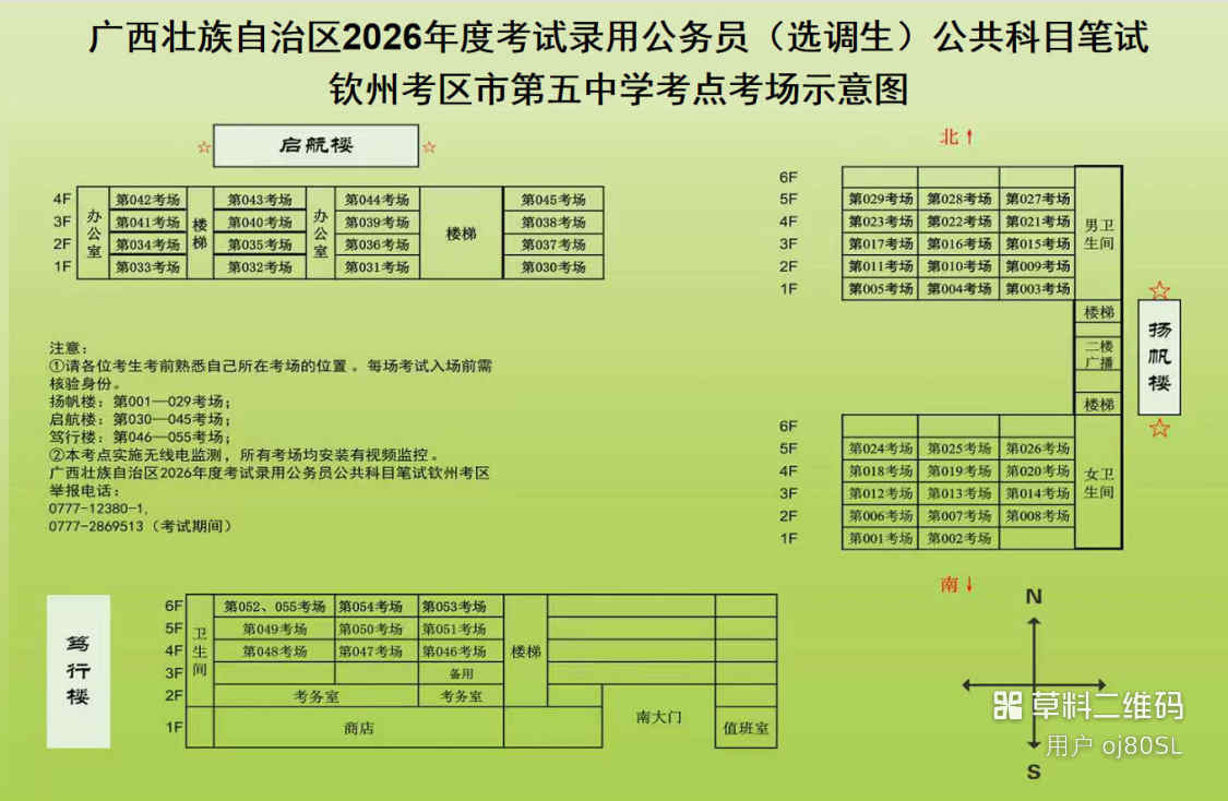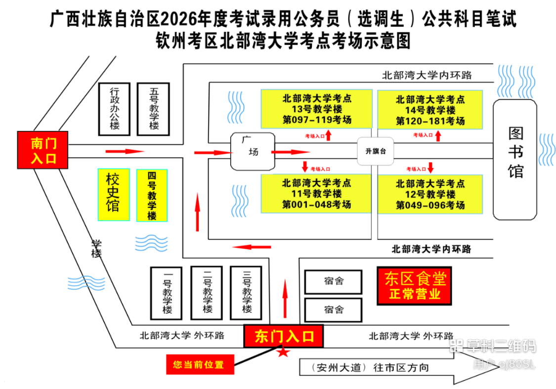 欽州考區(qū)共設(shè)三個考點,分別為北部灣大學考點、北部灣職業(yè)技術(shù)學校考點、欽州市第五中學考點。(考點地址和具體考場安排請掃附后的二維碼查看)