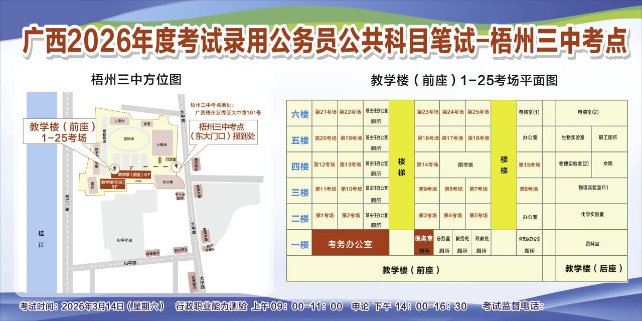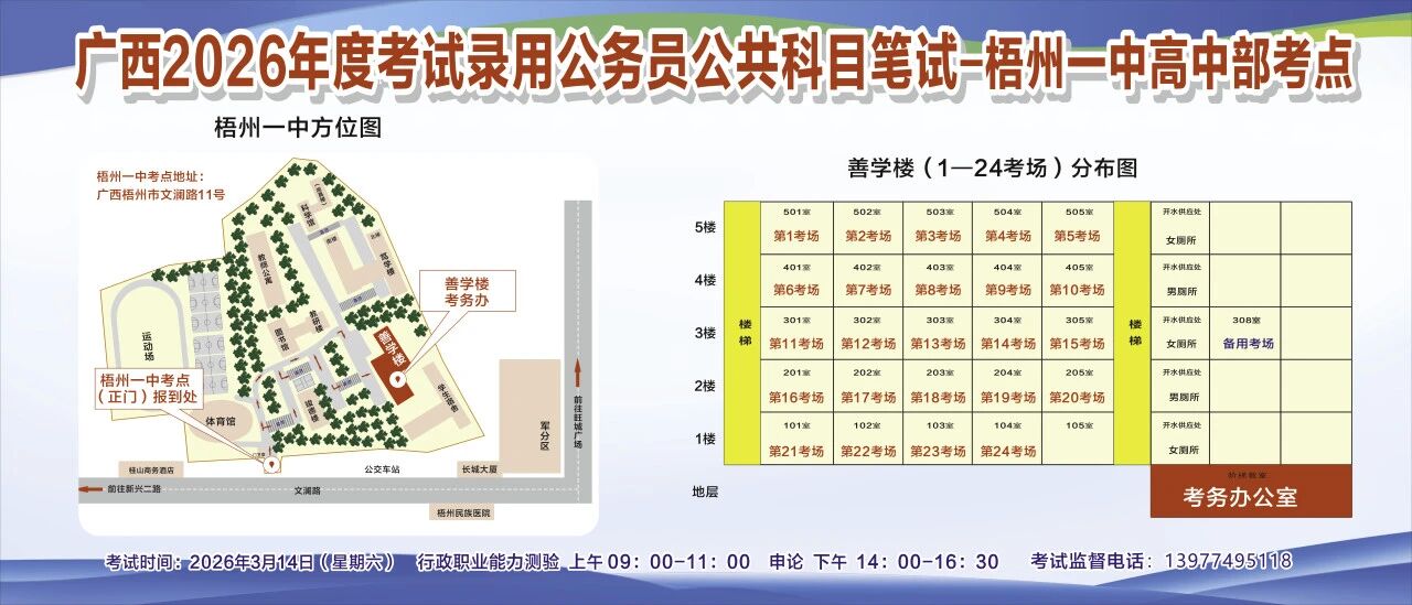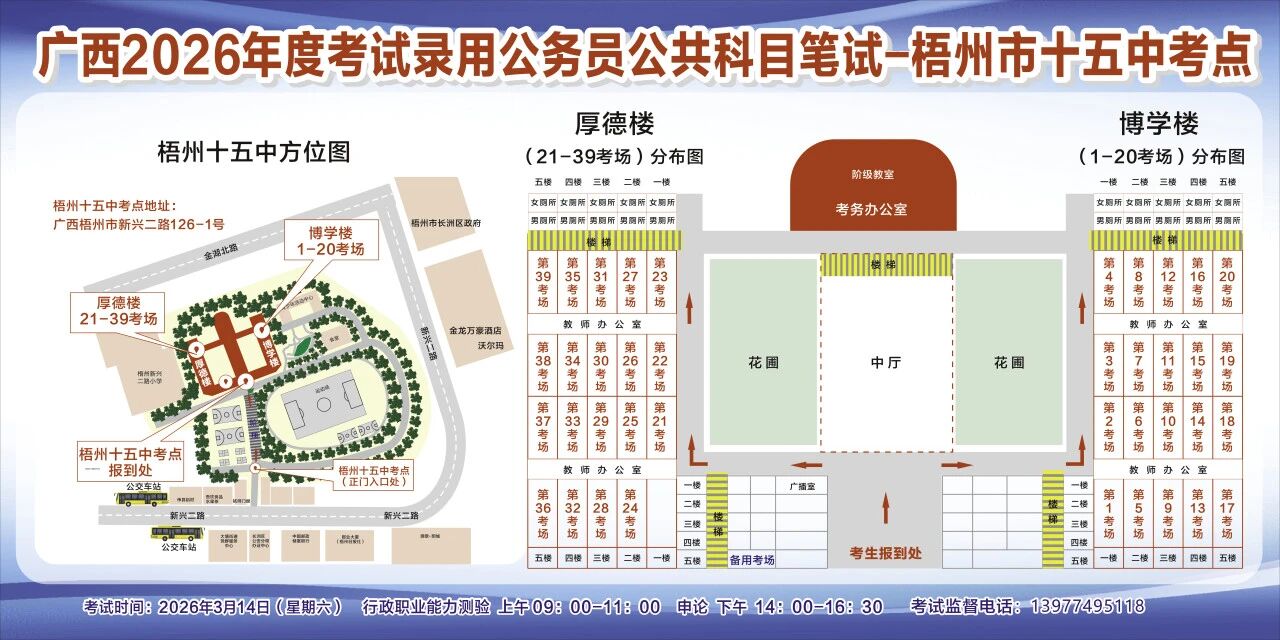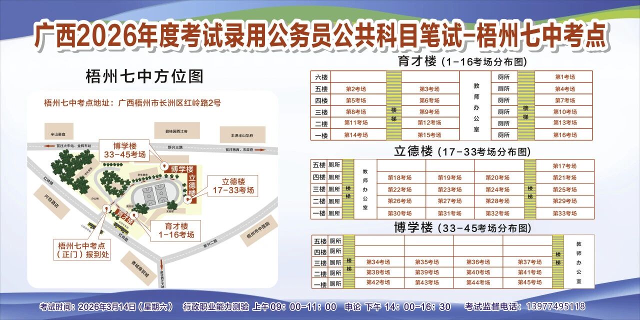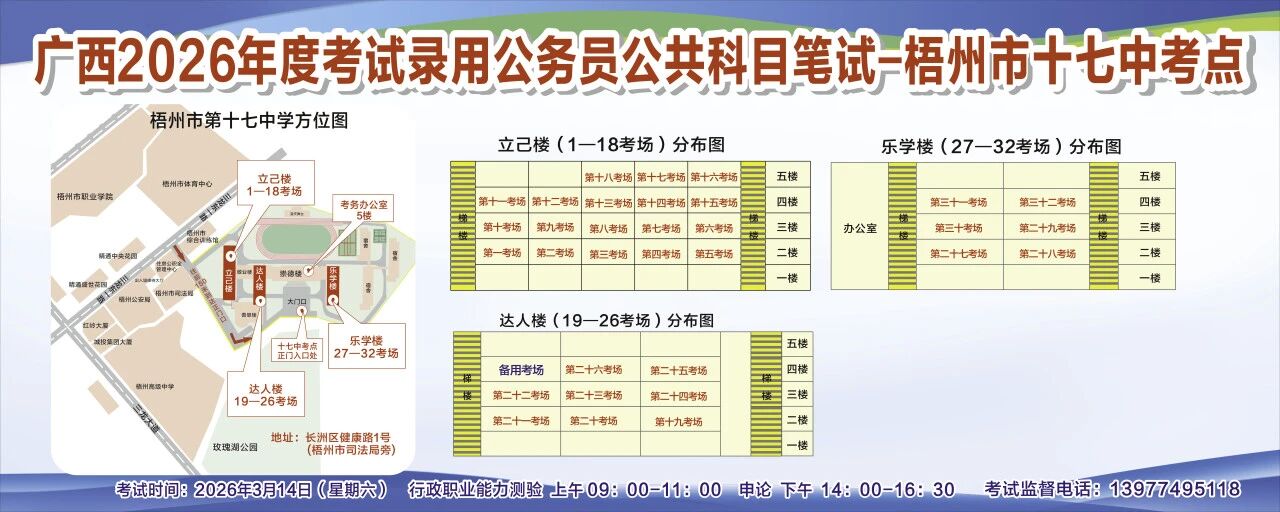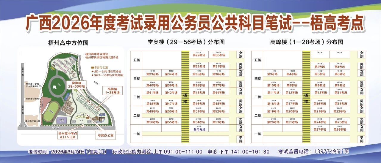一、廣西2026年度考試錄用公務(wù)員(選調(diào)生)公共科目筆試將于3月14日舉行,梧州考區(qū)共設(shè)置10個(gè)考點(diǎn),請考生提前熟悉各自考點(diǎn)位置、周邊環(huán)境及交通情況,考試當(dāng)天提前出門做好準(zhǔn)備,準(zhǔn)時(shí)參加考試。