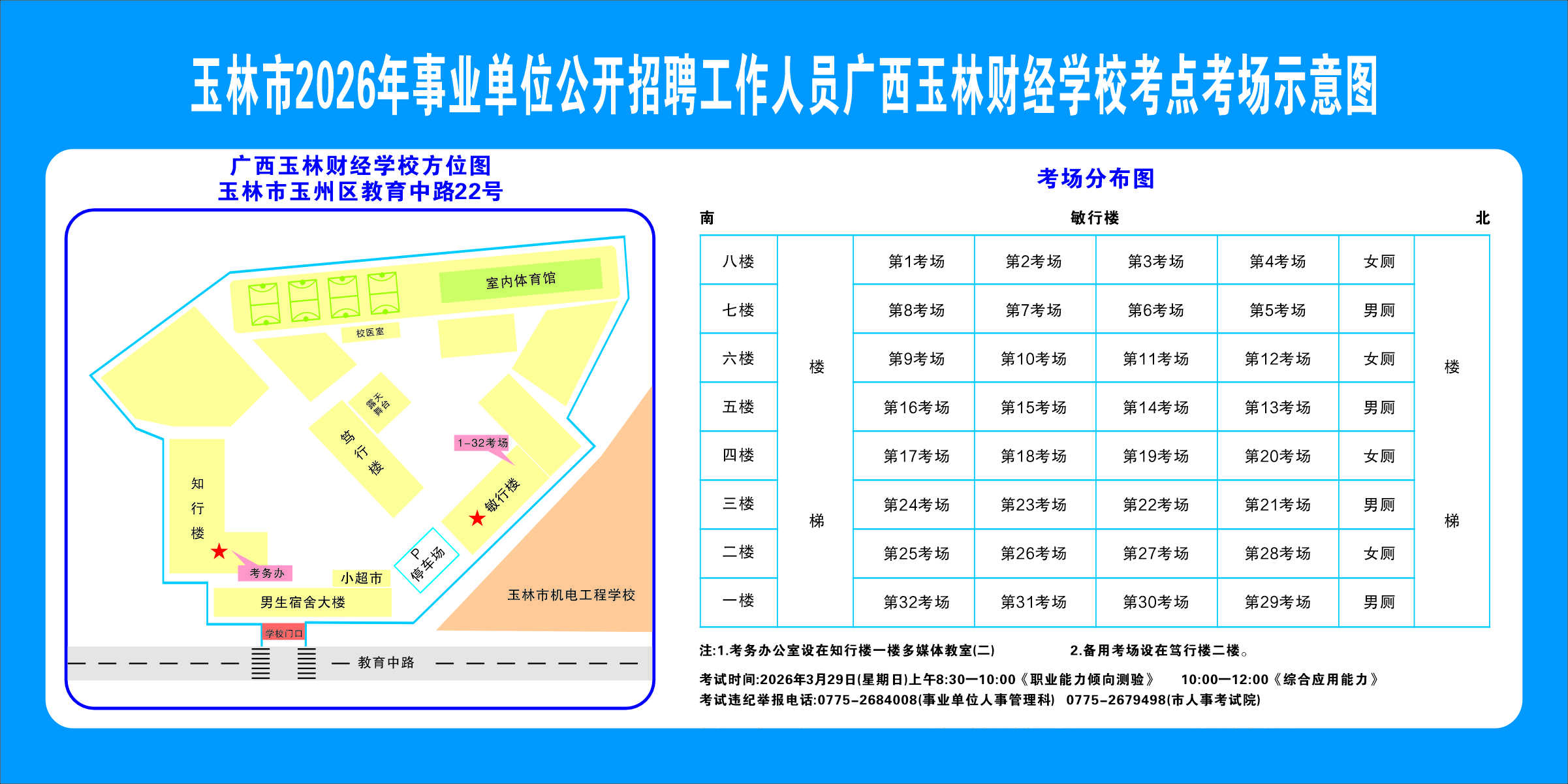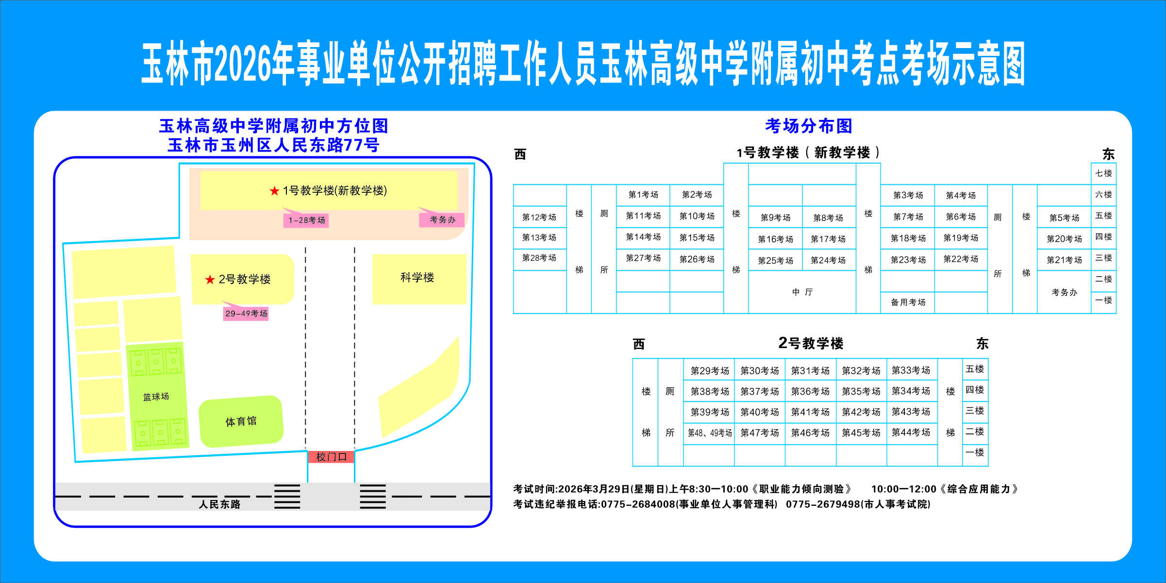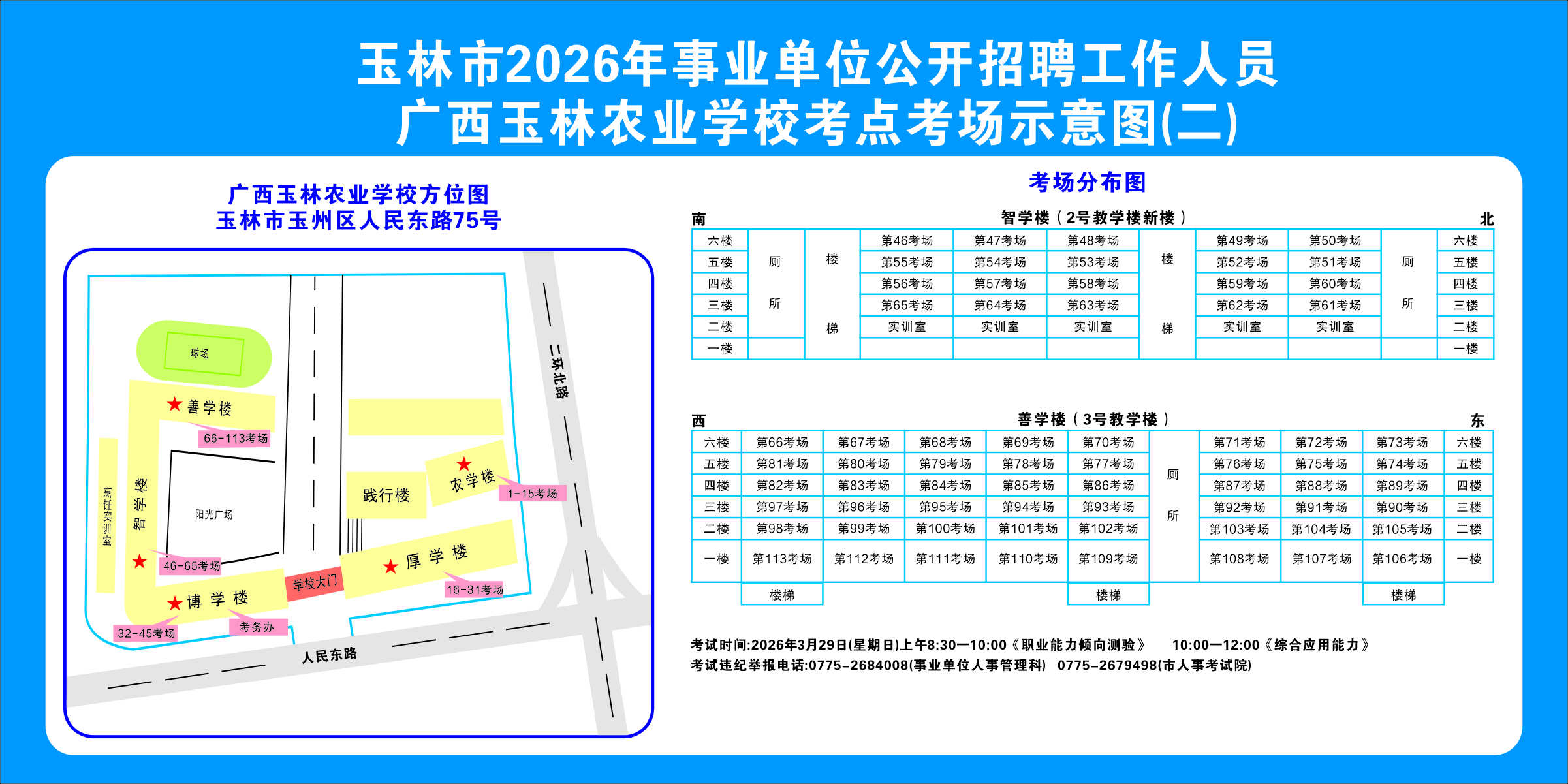 2.需要特別注意的是:玉林市第一職業(yè)中等專業(yè)學校考點是設在該校的東校區(qū)(人民東路東235號);玉林市第一中學考點分為運嶺路校區(qū)(二環(huán)北路1228號)、大北路校區(qū)(大北路453號)。