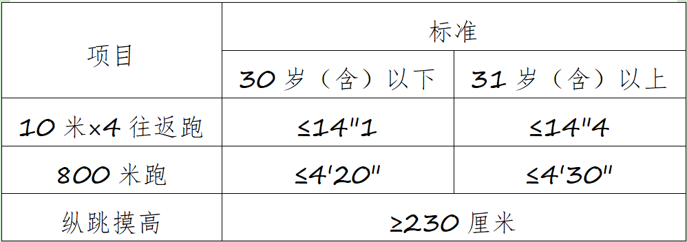 年齡計(jì)算時(shí)間截止到參加體能測(cè)評(píng)當(dāng)月。體能測(cè)評(píng)項(xiàng)目中,10米×4往返跑項(xiàng)目每人最多可測(cè)2次,男子1000米跑(女子800米跑)項(xiàng)目每人最多可測(cè)1次,縱跳摸高項(xiàng)目每人最多可測(cè)3次。1次測(cè)評(píng)達(dá)標(biāo),即視為該項(xiàng)目測(cè)評(píng)合格。體能測(cè)評(píng)所需的場(chǎng)地環(huán)境和器材,結(jié)合測(cè)評(píng)地點(diǎn)的實(shí)際情況設(shè)置。